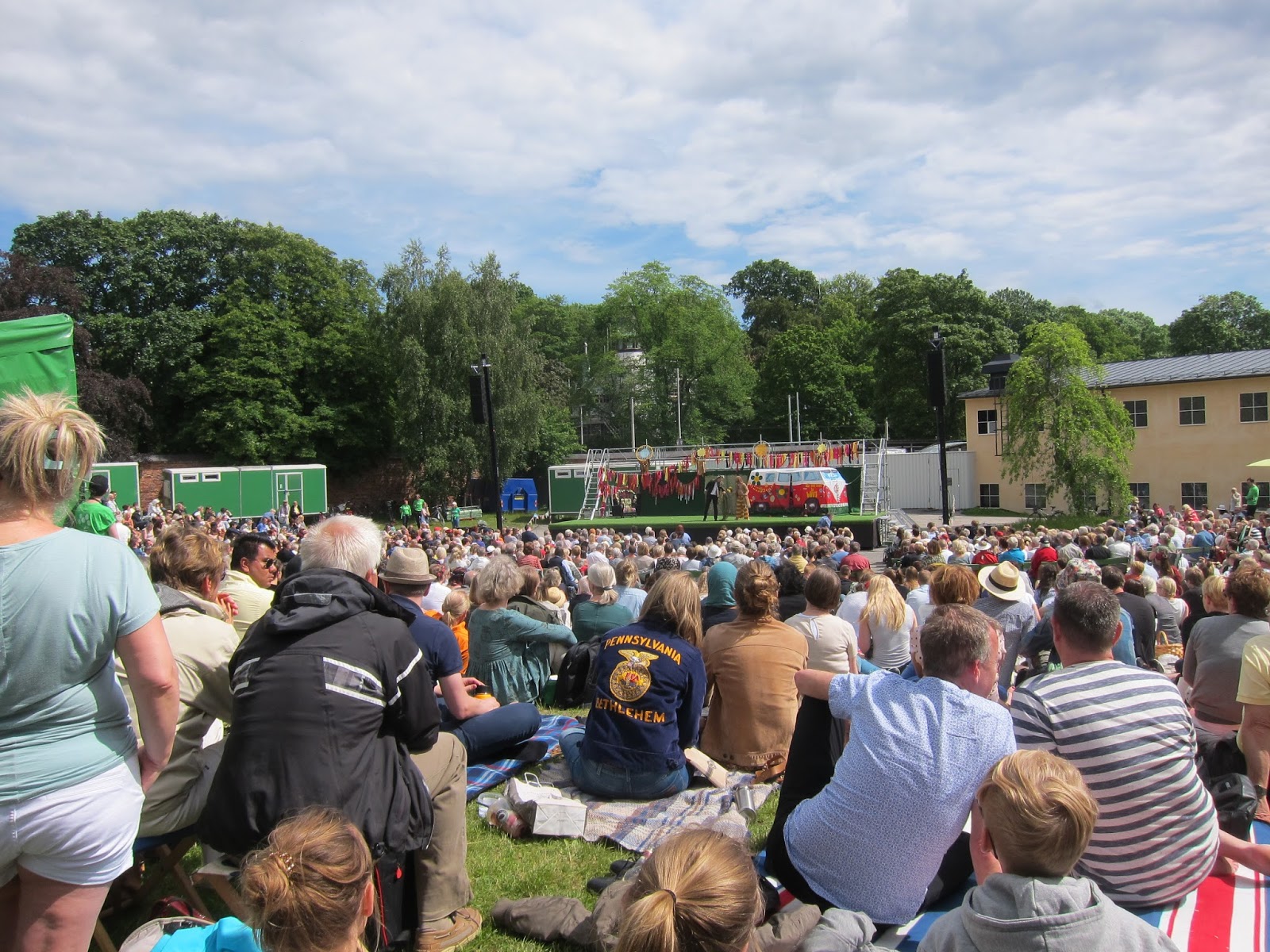 After we were done in the museum we had a short lunch and then stood in line to get into Skansen, an open-air museum about life in olden Stockholm. The lines were really long because Midsommer is a special time at Skansen with the raising of the Maypole, dancing around the Maypole, lots of bands playing, people wearing garlands of flowers they braided themselves, people with picnic lunches (you can bring your own food and drink into Skansen and we saw some pretty elaborate picnic set-ups), people just sitting or lounging all over the place, having a good time.
